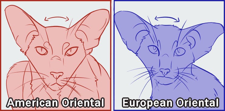 American Oriental cats seem to have their ears more upright and less of a dome shape forehead between their ears.