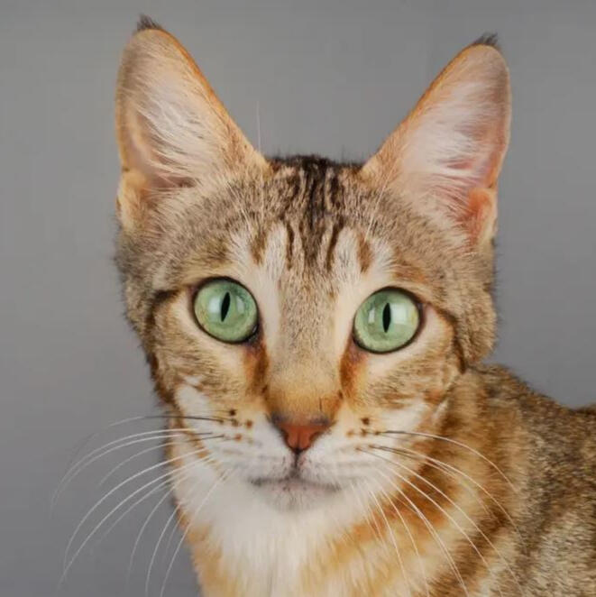Cats with the Oriental body type. Oriental cats are notorious for having wedged shaped heads, big ears and long tails. They are considered the rainbow breeds because of their diverse pattern and colour options.